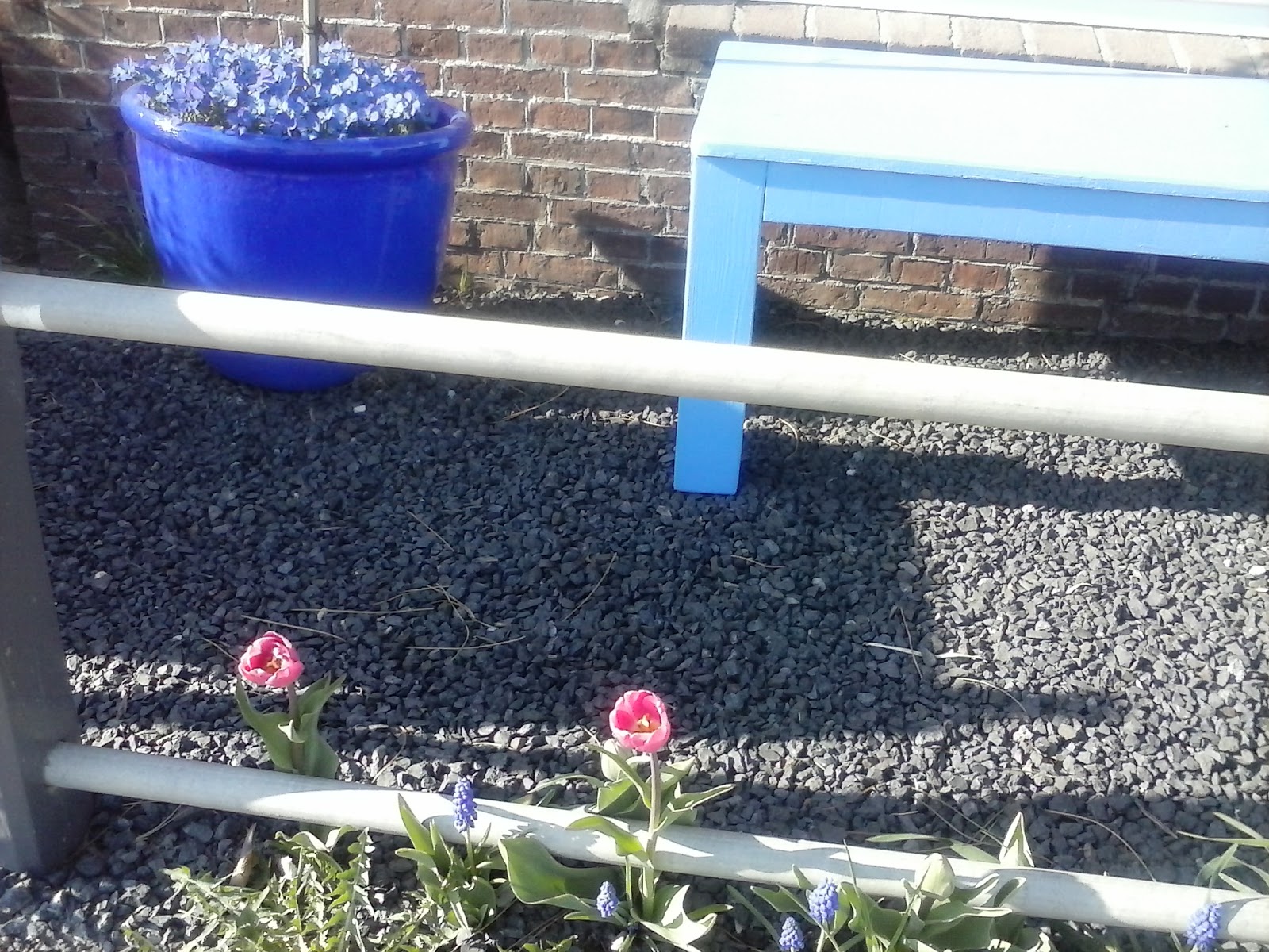 Genieten op het bankje. We hebben een engels hekwerk geplaatst en wat meer bloemen en bollen en planten aan de voorkant maar dat zien jullie de volgende keer.